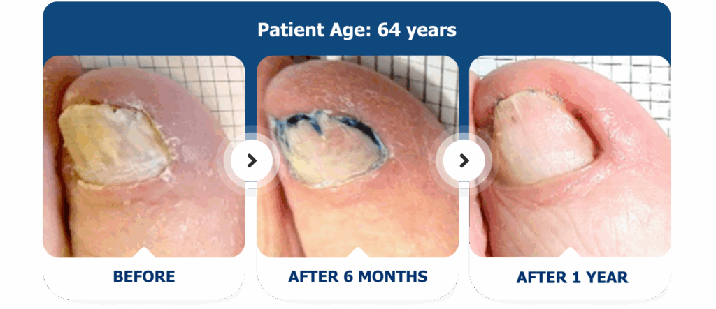 - Gradual Improvement – Toenails grow slowly; most people see cosmetic improvement as new nail replaces the damaged portion. Full regrowth commonly takes 9–12 months.
